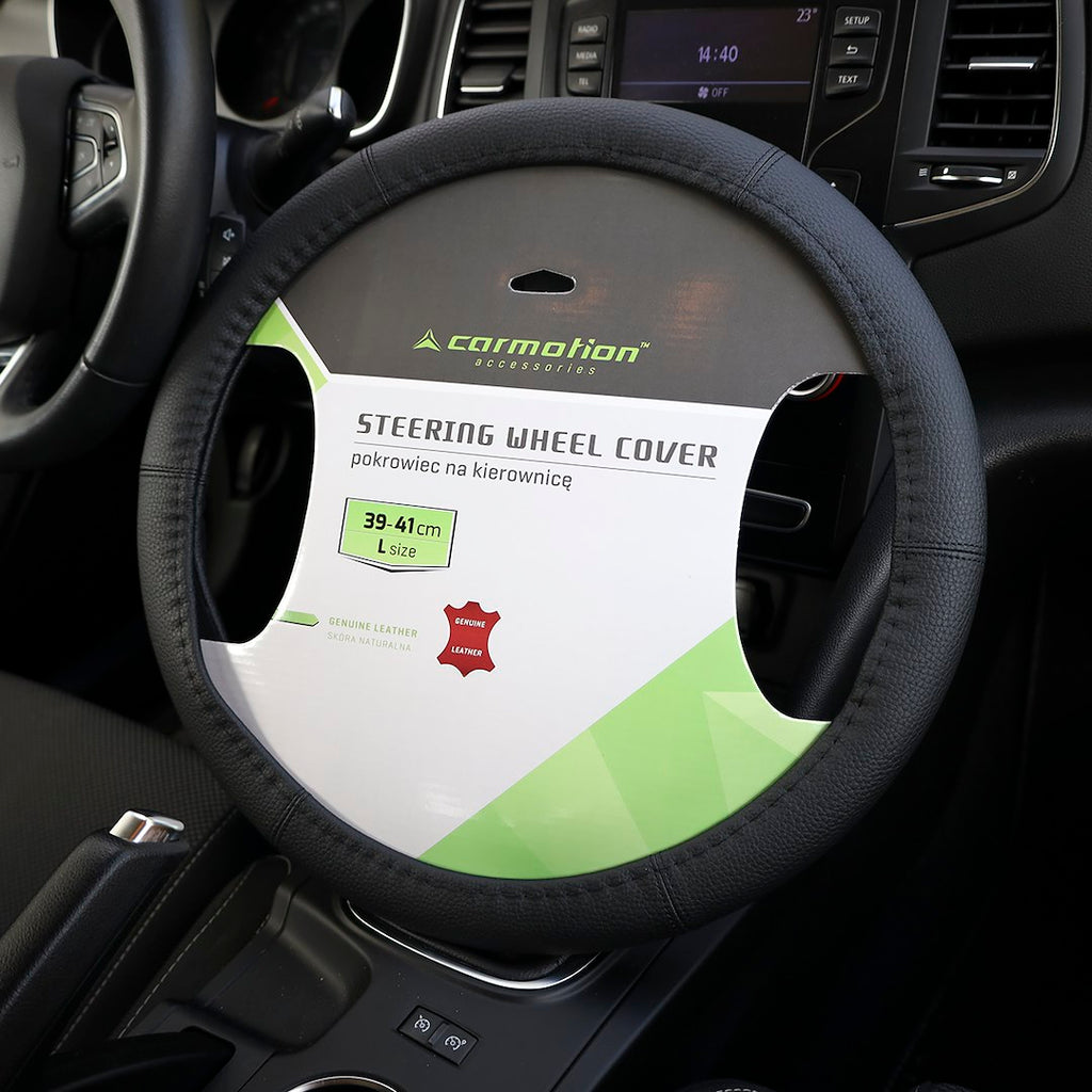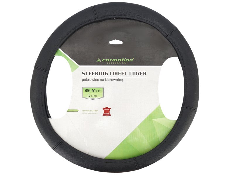 A Kormánykerék huzat "L" 39-41 cm, valódi bőr, fekete ideális megoldás, ha szeretné megóvni kormánykerékét és egyben fokozni az autó belső terének megjelenését. A prémium anyaghasználatnak köszönhetően tartós, elegáns és kényelmes tapintású, így hosszú távon is élvezheti használatát.