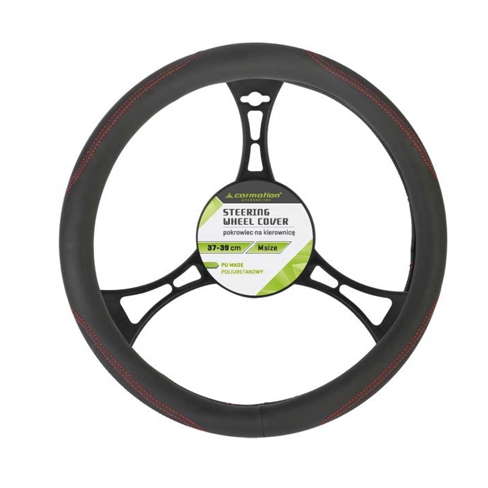 Kormányvédő huzat PU bőrből (37–39 cm, fekete, piros varrással)