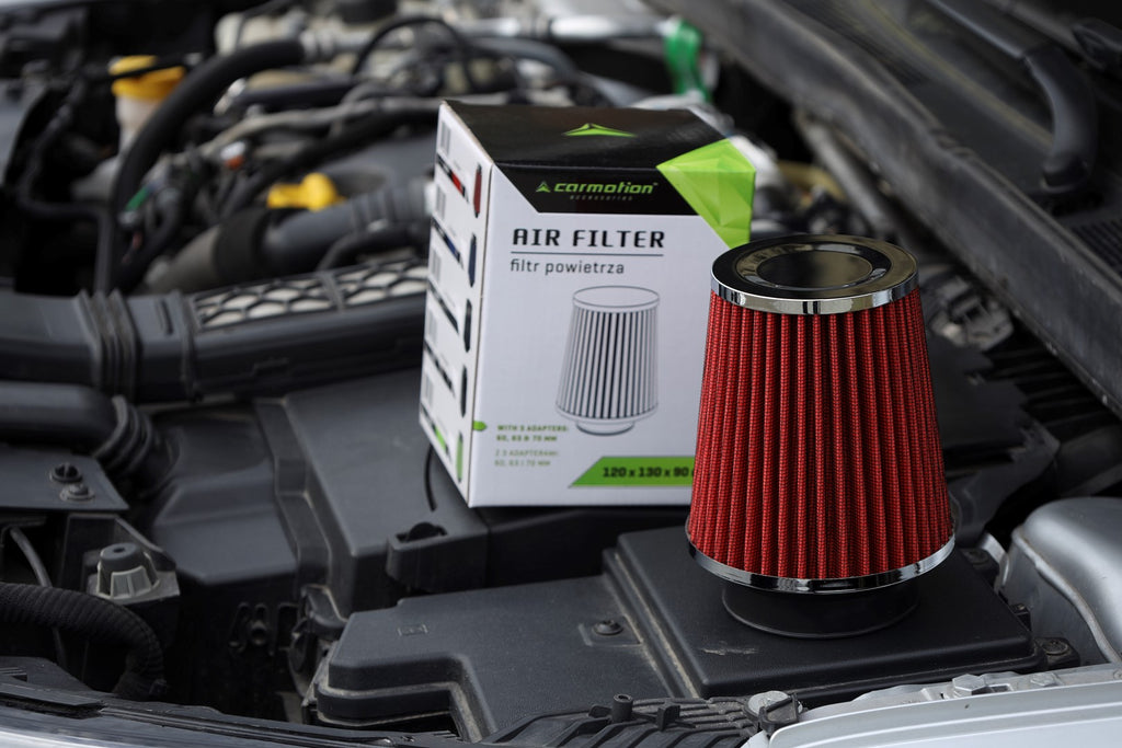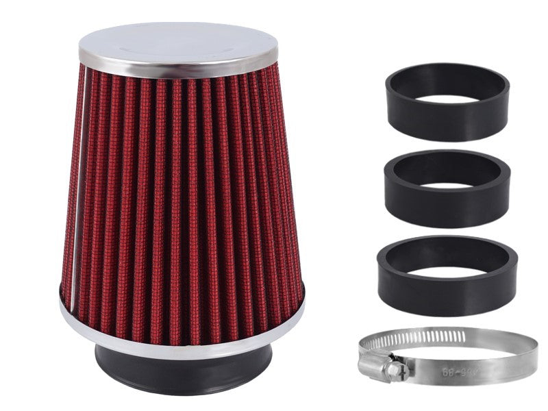 Légszűrő, kúpos, 120x130x90 mm, piros / króm, adapterek: 60, 63, 70 mm
