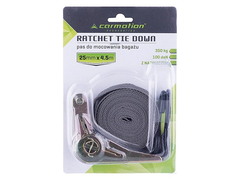 A Ratchet rögzítő heveder a rakomány rögzítéséhez, 25mm x 4,5m, 350 KG egy kiváló megoldás, amely garantálja a rakomány biztonságos szállítását. Az egyszerű használat és a megbízható kialakítás révén időt és energiát takarít meg, miközben kényelmet biztosít a szállítás során.